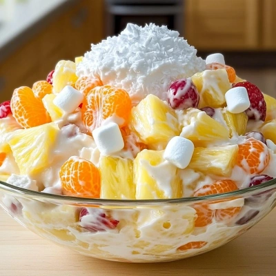 This dish carries that unmistakable American potluck charm, but its heart leans tropical—an easy, cheerful nod to Hawaiian-inspired flavors that became beloved at church suppers, family reunions, and holiday tables. What fascinates me as a cook is the contrast: the structure of the fruit, the give of the marshmallows, and the way the whipped dressing cushions everything without weighing it down. It’s a study in texture management, really. I remember seeing a bowl of this at a summer gathering, glistening under the light, and watching guests come back for seconds before the main course was even finished. That’s the power of a well-made fruit salad: it’s playful, generous, and impossible to ignore.